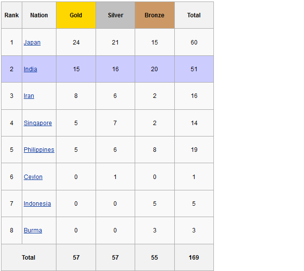 Hàn Quốc không thể tham gia do chiến tranh. NC Kok của Singapore đã giành huy chương vàng đầu tiên tại môn bơi bướm 1500 mét. Chiến thắng tất cả bốn Freestyle bơi các sự kiện, anh đoạt được bốn huy chương vàng. Nhật Bản đứng đầu với 24 Huy chương vàng, 20 Huy chương bạc và 14 huy chương bằng đồng, theo sau là Ấn Độ với 15 huy chương vàng, 18 bạc và 19 huy chương đồng.