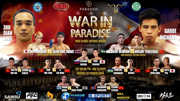 Song song với các trận đấu của võ sĩ Việt Nam, sự kiện WBO Title Match: War in Paradise sẽ có đến 3 trận đấu bảo vệ đai vô địch WBO toàn cầu đầy hấp dẫn. Ở trận đấu tâm điểm, nhà ĐKVĐ người Trung Quốc Zhu DianXing (11 trận thắng sau 12 lần thượng đài, 10 thắng bằng knock-out) sẽ có màn bảo vệ đai WBO toàn cầu hạng cân minimum (48kg) trước tay đấm người Philippines Richard Garde (8 thắng sau 9 lần thượng đài, 7 thắng bằng knock-out).