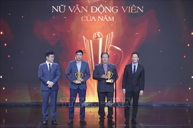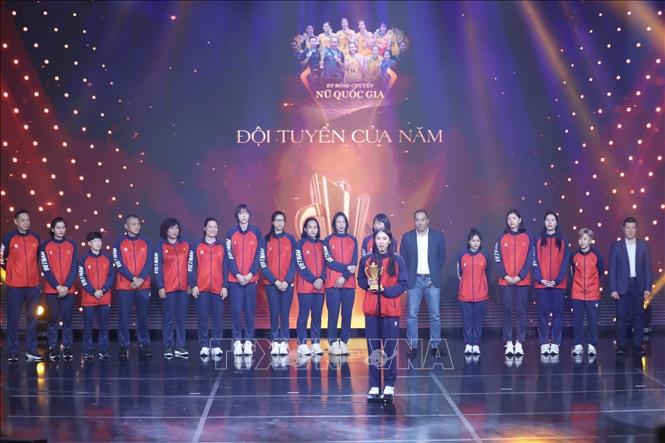 Ban tổ chức trao Cúp Chiến thắng, hạng mục Đội tuyển của năm cho đội tuyển Bóng chuyền nữ. Ảnh: Minh Quyết/TTXVN
