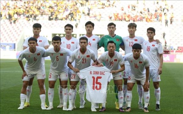 Đội hình ra sân của U23 Việt Nam trong trận gặp đội tuyển Malaysia diễn ra tối 20/4/2024, trên sân vận động Khalifa, Qatar. Ảnh: VFF/TTXVN phát