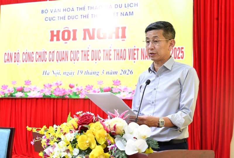 Chiều 19/3/2026, tại Hà Nội, Cục Thể dục thể thao (TDTT) Việt Nam đã tổ chức Hội nghị cán bộ, công chức năm 2025. Hội nghị là dịp để toàn ngành nhìn lại một năm đầy nỗ lực, đồng thời khẳng định ý chí quyết tâm, tinh thần đổi mới sáng tạo để đưa sự nghiệp TDTT nước nhà vững bước tiến vào kỷ nguyên vươn mình của dân tộc.